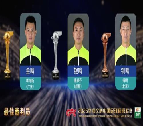 北京时间12月12日,2025赛季中国足球职业联赛颁奖会在上海进行。目前,裁判相关奖项已经公布。其中,李海新当选2025赛季中超金哨,唐顺齐当选银哨,傅明当选铜哨。