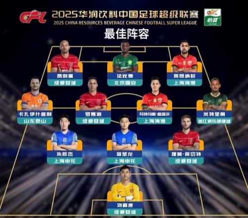 中超最佳阵容:刘殿座(成都蓉城);朱辰杰(上海申花)、蒋圣龙(上海申花)、莱切特(成都蓉城);卡扎伊什维利(山东泰山)、罗慕洛(成都蓉城)、维塔尔(上海海港)、米特里策;费利佩(成都蓉城)、法比奥(北京国安)、莱昂纳多(上海海港)